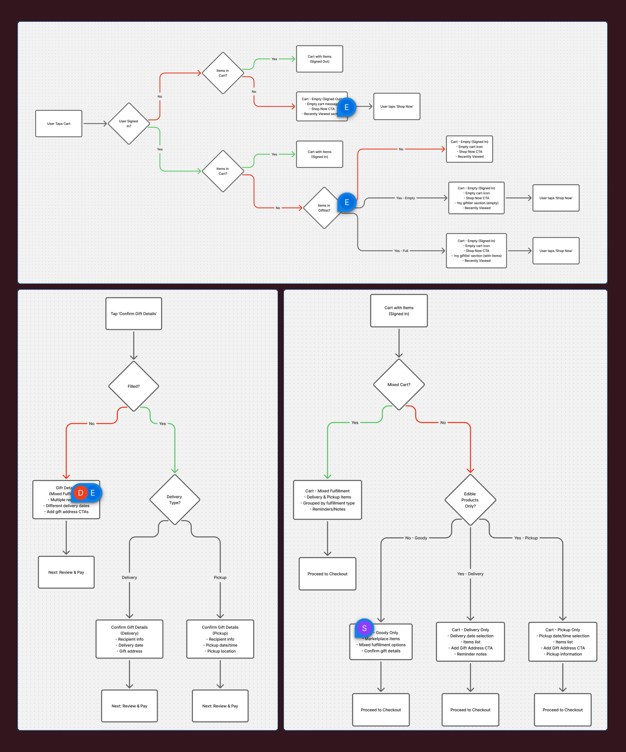 Created and annotated new flows for user journeys including mixed cart, loyalty users, gifting and personalization