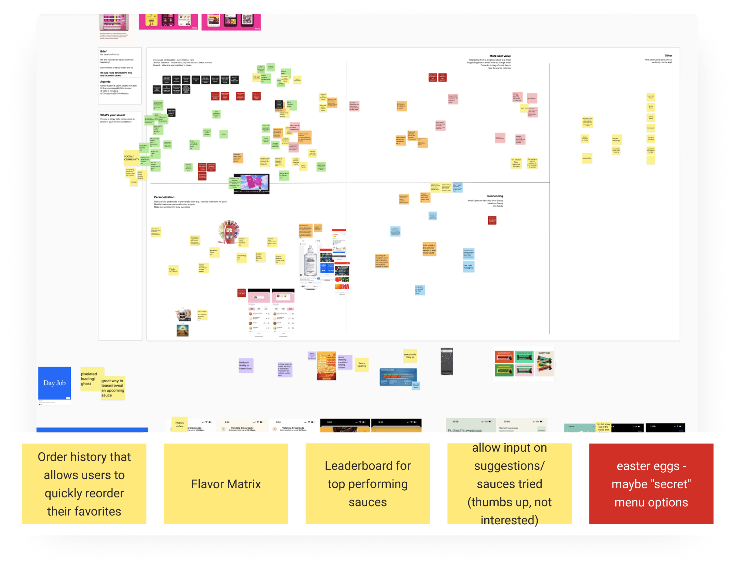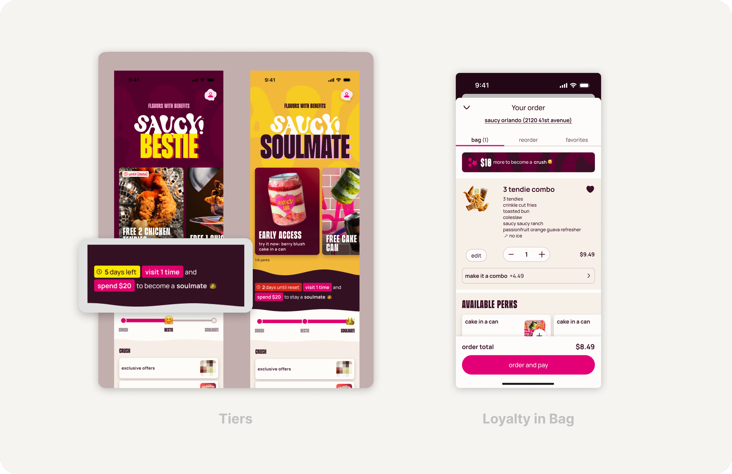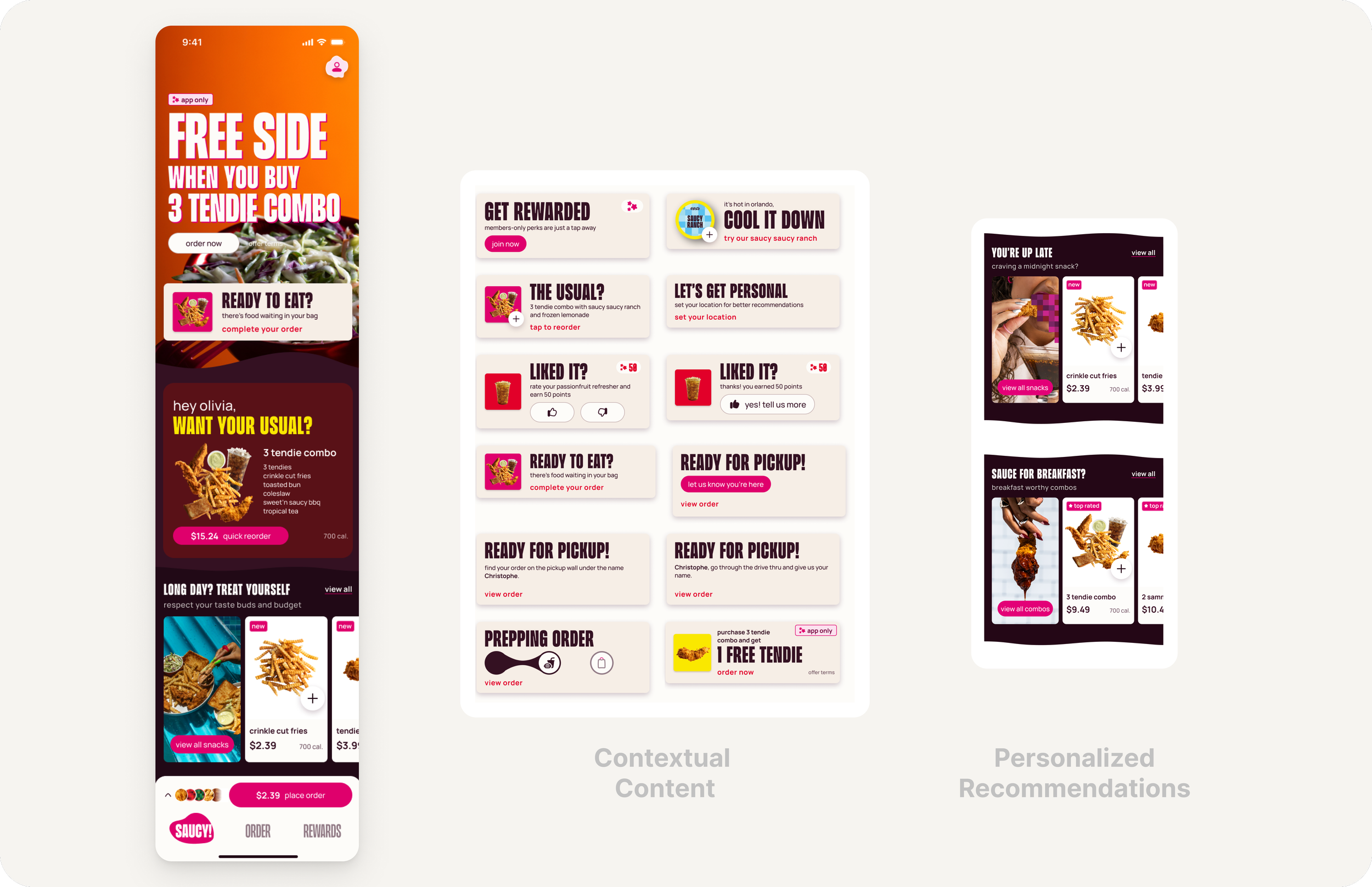 The ordering flow was designed around speed and confidence, though it was important for it to feel uniquely Saucy. Starting at the Saucy! (Home) tab highlights featured products and allows for personalization.