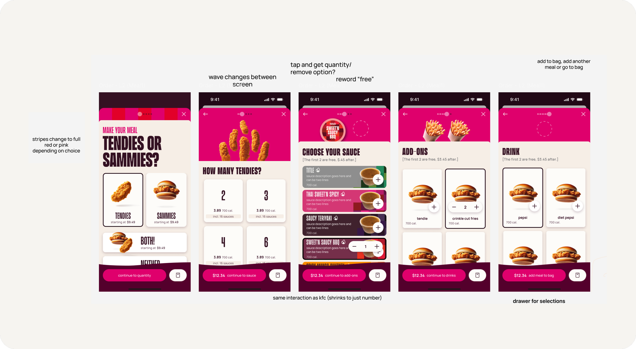 Designed multi-surface sauce and combo selection flows that balanced high customization with low cognitive load across app, kiosk, and web.